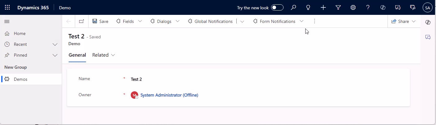 Compared to a form notification, a global notification is shown on the whole app, it will span wider across the navigation and above the ribbon. It also has more options! We can include an action button and a close button and also have an additional notification level of SUCCESS.